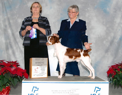 It is awesome to think we now have 3 champions from our line of Brittany bird dogs, finishing within months of each other. Julie exclusively handled Thistle to her recent championship. I really desire to handle Hemi to his and it is within reach. We're so glad we have found a wonderful professional handler in Joyce C. who has done such a nice job of finishing Pippin and Bullet. While I did put single or double show points in the past on Treasure, True, Pippin, and of course Hemi (all dogs which we personally bred) the majors have always remained elusive to me, until now! (All of Treasure's minor points have been won in Bred By Exhibitor.)